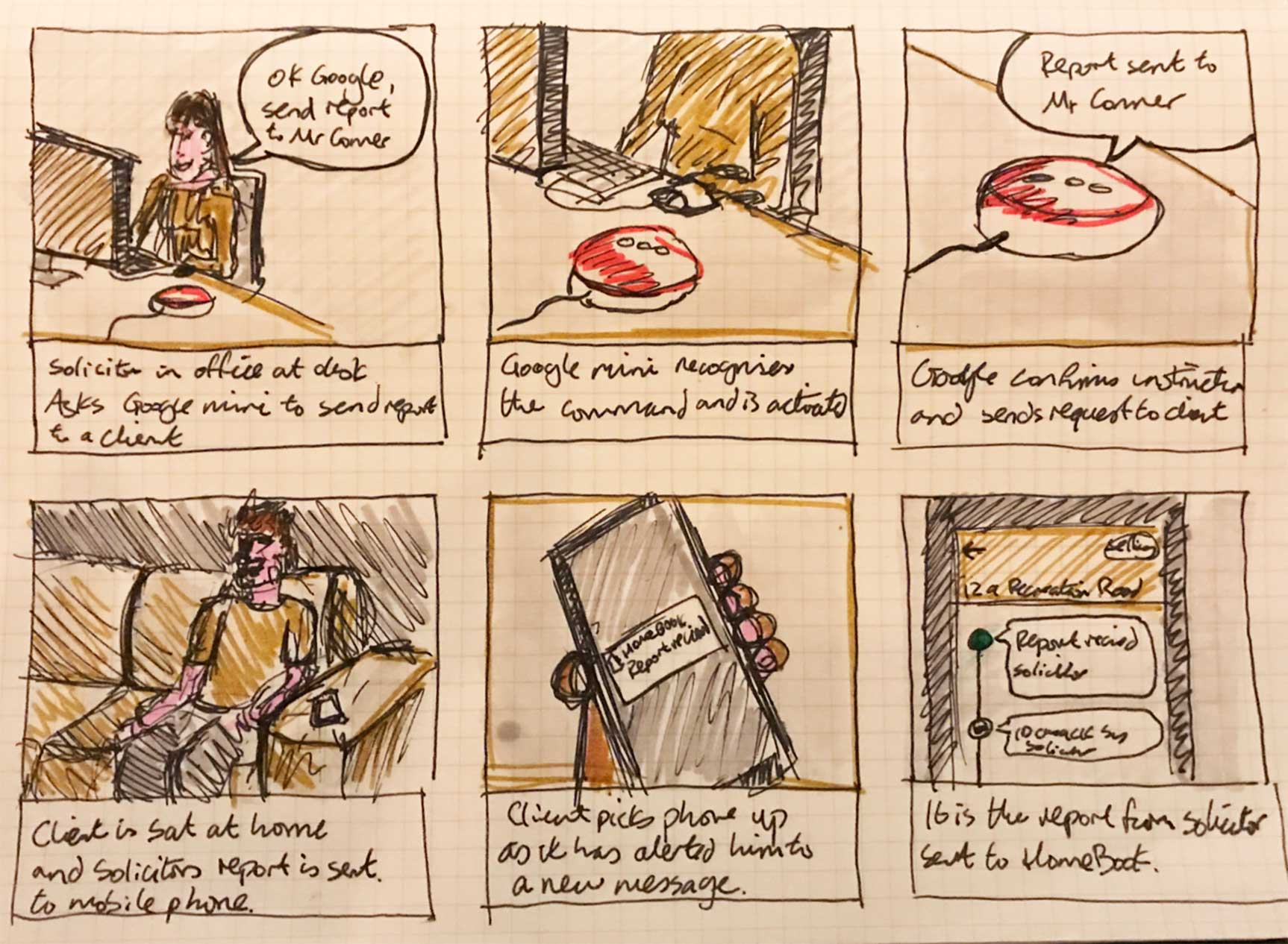 They are unlikely to use the app interface to communicate their updates so more research is needed into how it can be integrated with their current workflows and a technical solution found. One possibility might be to link it to a virtual assistant within the workplace, such as Google Mini or Alexa. A storyboard of this example can be found below: