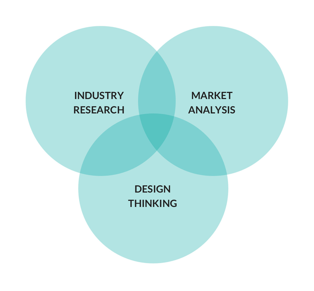 The research is split into three parts - Industry Research, Market Analysis and Design Thinking - and forms a non-linear, continuously overlapping process.