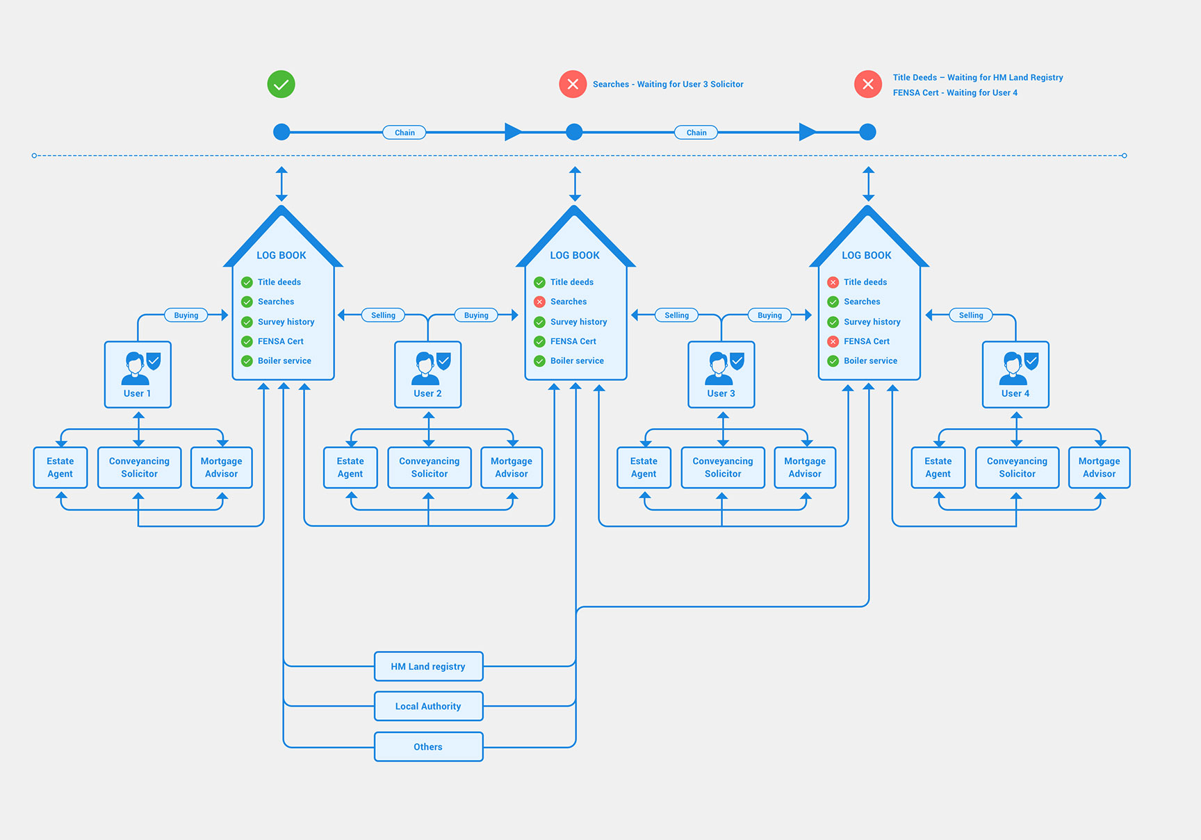 The flow below illustrates this overall concept. It shows a chain of three houses. At the top is the Chain View, which is visible to all parties. Underneath are the Log Books for the three properties being sold/purchased and the four users involved.