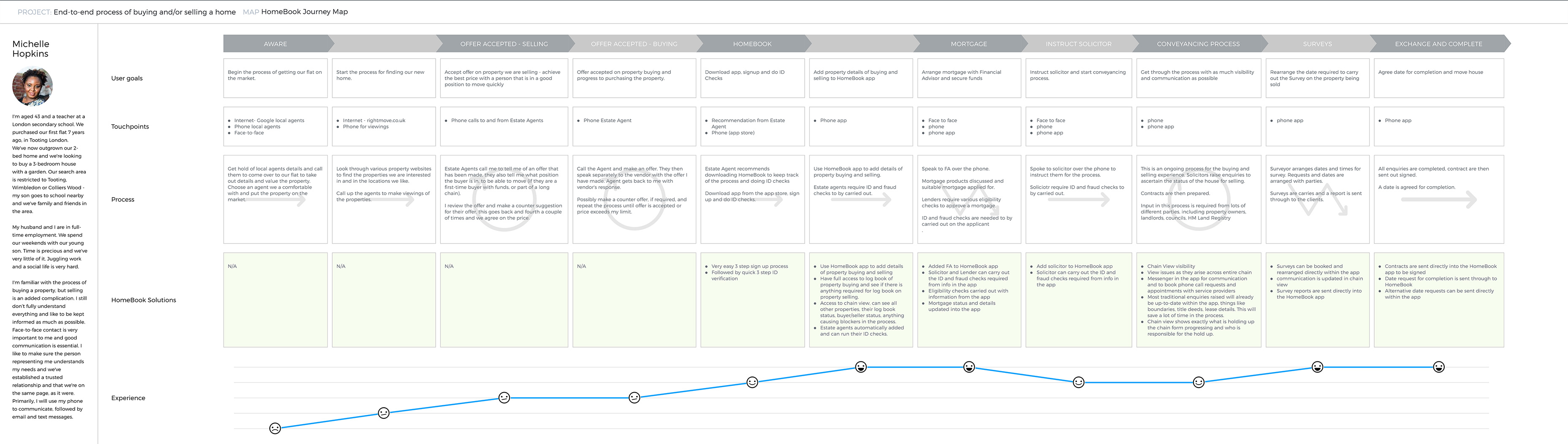The narrative was worked into a journey map to illustrate the newly-redesigned user journey. It outlines the user goals, touch points and processes. It then shows how the HomeBook app could be used to address these processes in a more user-focused way.