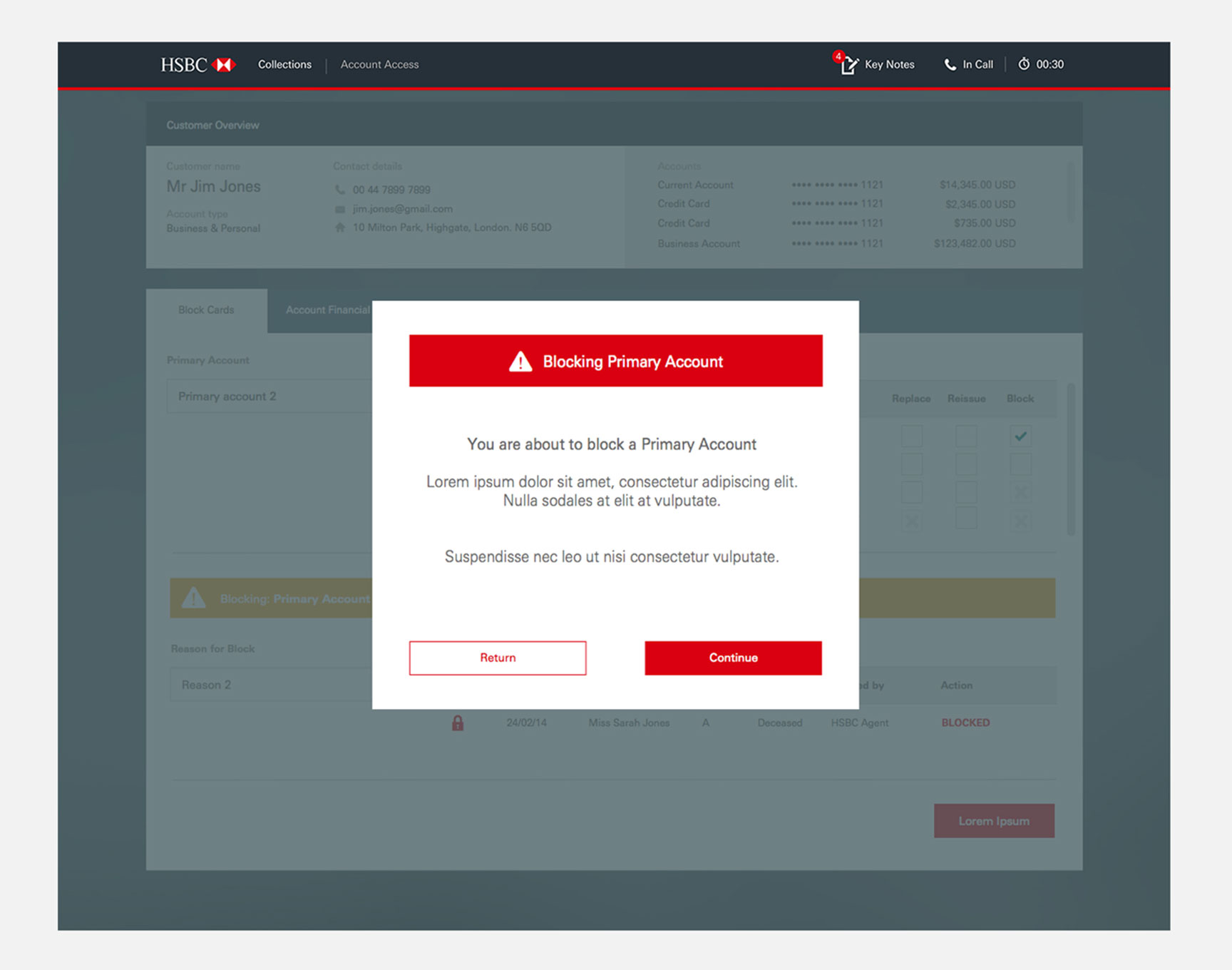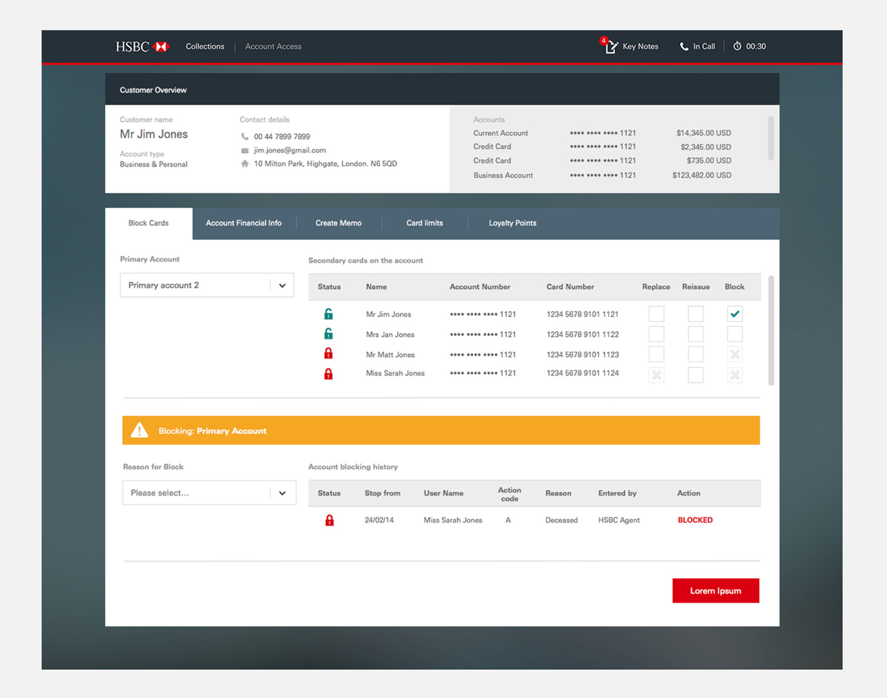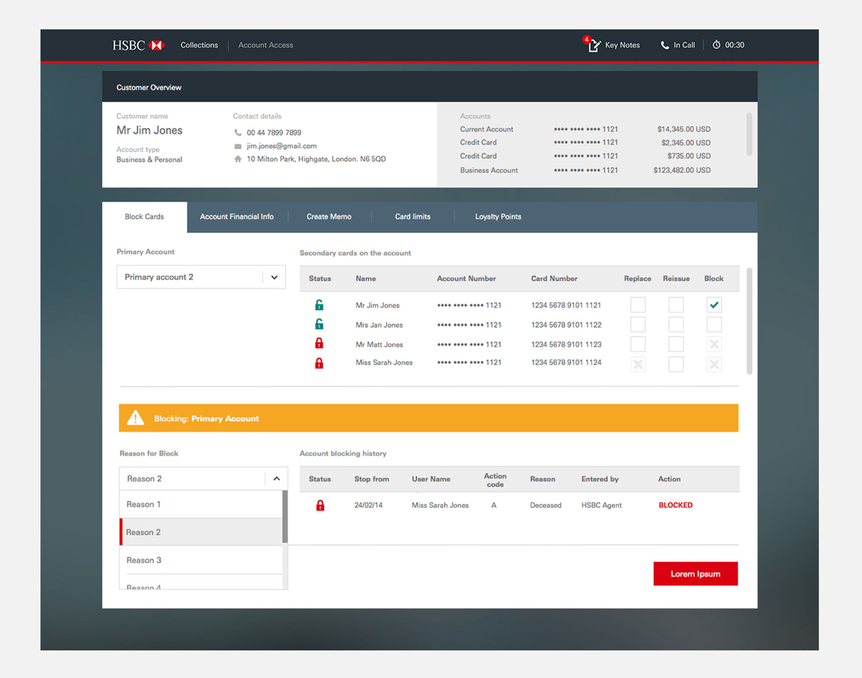 Working as the lead UX designer, and using Sketch, my team devised a simple way of blocking, replacing or reissuing a credit card across multiple accounts.