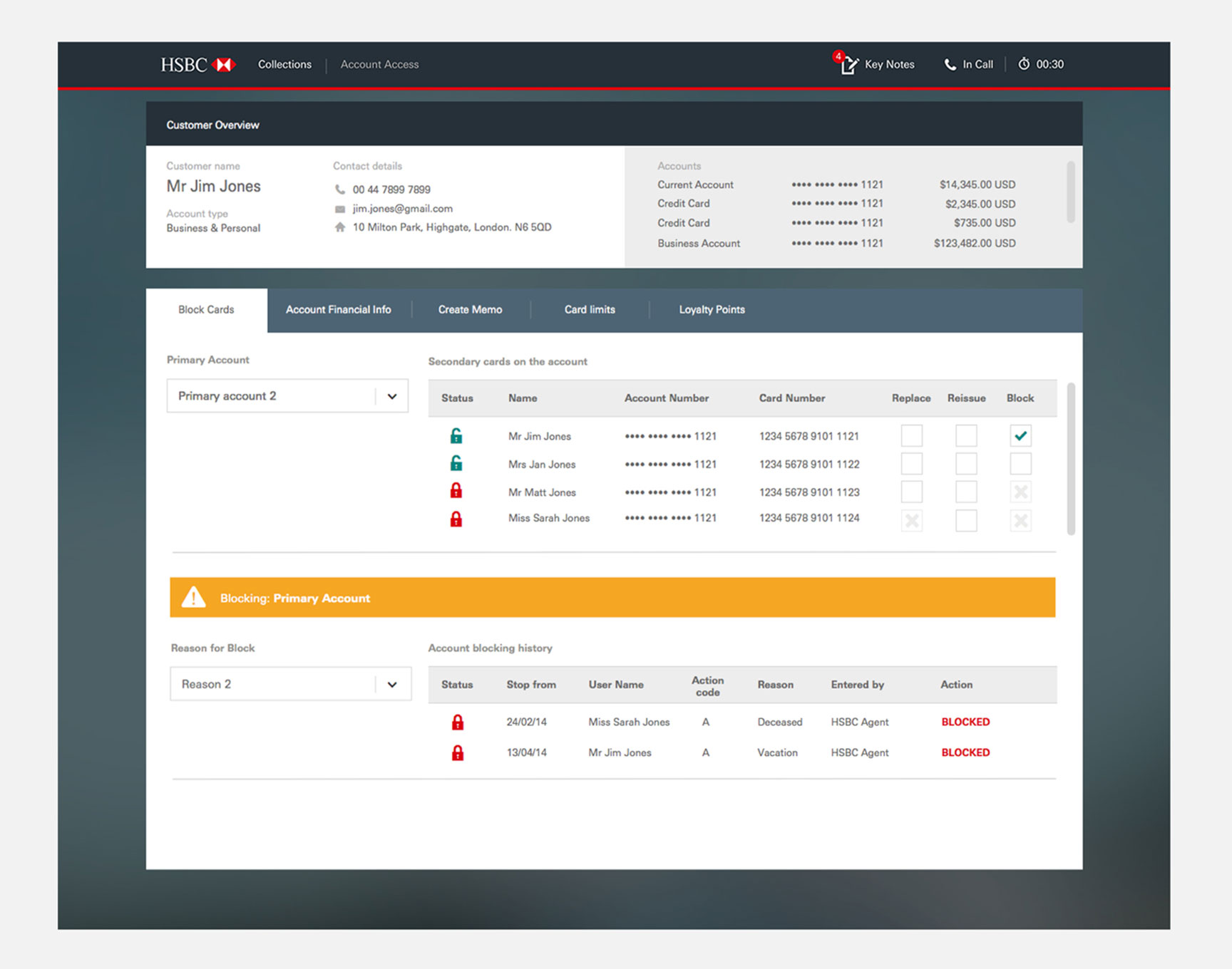 Below demonstrates how a customer service representative would go through the process of blocking a customer’s credit card.